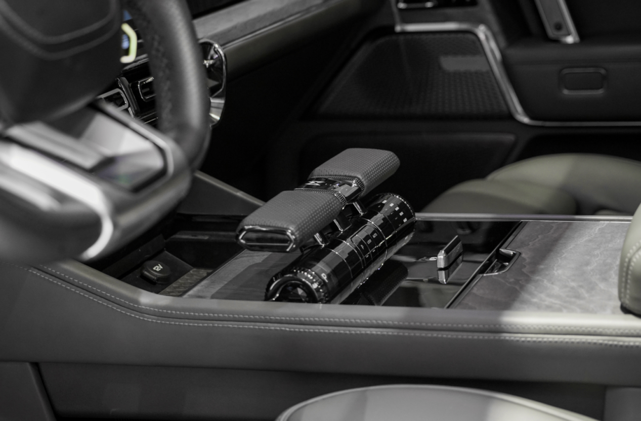 设计细节上也呼应了中国文化的军工元素。比如方中自圆的出风口是古烽火台式设计;门内侧把手像一把手枪;中控台上的操作杆集成换挡、底盘升降、越野模式调节,像飞行器的手柄–整个布局没有外观那种凌厉气势,外刚内柔。